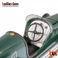 Surprisingly sophisticated racecars in 1:8 scale raced tethered to a pole or to a chain track in a banked wooden racetrack, reaching speeds in excess of 150 mph…Imagine a corner of the 1939 New York World’s Fair. A throng of thousands massing around a mini car-drome where racecars are being prepared for a major race. The scream of the engines fills the air. A mini NASCAR, Le Mans, Nuburgring…An American pastime; technology, cars, excitement! Spindizzies, named for the dizzying speeds they reached, were inspired by full size racecars. Handcrafted, large-scale miniatures were made by skilled owners, who often spent hundreds of hours on each car. They were true pieces of combined art and contemporary technology. Cherished by their owners, they now are coveted by collectors and car-buffs the world over. At nearly 20″, 50cm, length the Bantam is a commanding presence in any man’s den, library, office, or reception area. Truly hand tooled, traditionally die stamped body parts, in aluminum, brass and polished mahogany wood. Lift the hood; admire the replica engine. Turn the cockpit wheel and angle the front wheels. Smell the luxurious leather of the driver’s seat. This is a touch of car history. High-tech nostalgia at its best.