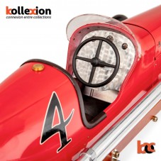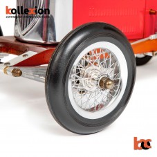 Surprisingly sophisticated racecars in 1:8 scale raced tethered to a pole or to a chain track in a banked wooden racetrack, reaching speeds in excess of 150 mph…Imagine a corner of the 1939 New York World’s Fair. A throng of thousands massing around a mini car-drome where racecars are being prepared for a major race. The scream of the engines fills the air. A mini NASCAR, Le Mans, Nuburgring…An American pastime; technology, cars, excitement! Spindizzies, named for the dizzying speeds they reached, were inspired by full size racecars. Handcrafted, large-scale miniatures were made by skilled owners, who often spent hundreds of hours on each car. They were true pieces of combined art and contemporary technology. Cherished by their owners, they now are coveted by collectors and car-buffs the world over. At nearly 20″, 50cm, length the Bantam is a commanding presence in any man’s den, library, office, or reception area. Truly hand tooled, traditionally die stamped body parts, in aluminum, brass and polished mahogany wood. Lift the hood; admire the replica engine. Turn the cockpit wheel and angle the front wheels. Smell the luxurious leather of the driver’s seat. This is a touch of car history. High-tech nostalgia at its best.