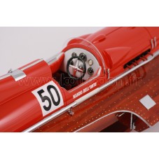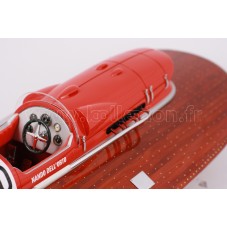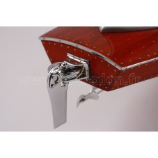 Véritable objet d’exception, cette maquette du Arno XI ( moteur Ferrari) d’une longueur de 91 cm a été réalisée à l’échelle 1/7ème. Fidèle réplique du mythique hydroplane, cette maquette est entièrement réalisée à la main à partir de matériau noble : Acajou pour le bois et véritable sellerie marine. Toutes les pièces d’accastillage sont en laiton chromé réalisées sur mesure par par des bijoutiers. 10 couches de vernis sont appliquées pour obtenir une excellente brillance et profondeur de vernis.